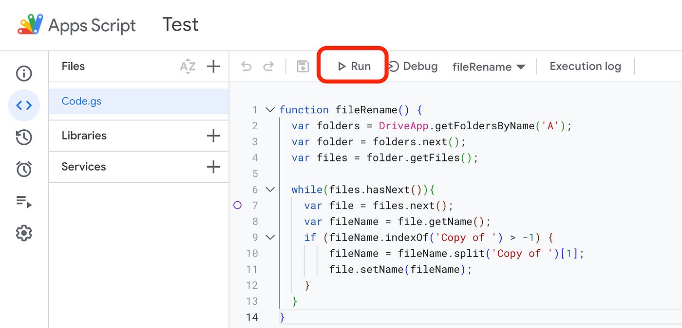 After pasting the script, it’s showtime! Return to your Google Drive, make sure all files you want to rename are in the “A” folder, and then run your script from the Script Editor by clicking the “Run” button.