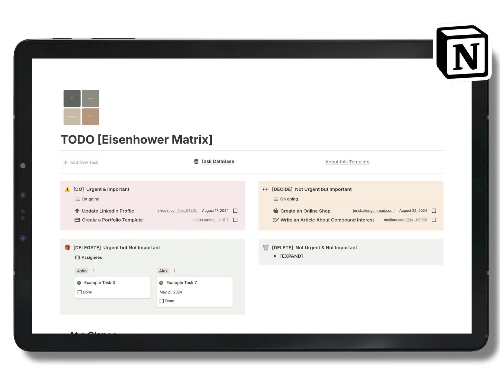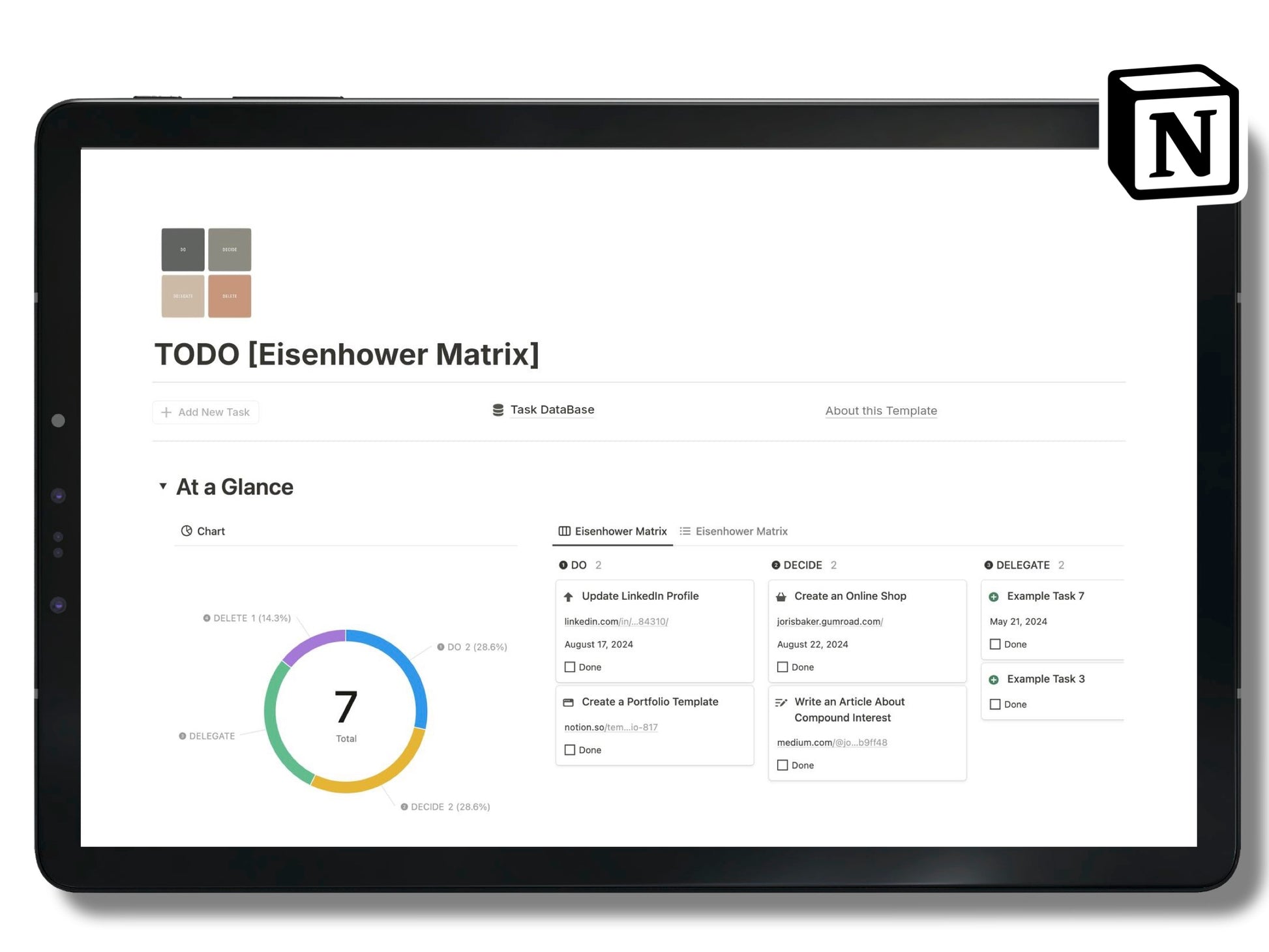 Not all tasks are created equal. The Eisenhower Matrix helps you sort to-dos by urgency and importance, ensuring you focus energy where it matters most. This Notion template provides a ready-to-use quadrant-based system to categorize tasks as Do First, Schedule, Delegate, or Eliminate. Gain control of your workload and minimize time-wasting activities.